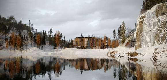 Отель в Карелии, спроектированный архитектурным бюро Chado, вырастает из ландшафта в образе гигантского валуна, расколотого надвое. В центре этой композиции рождается драматичное общественное пространство, напоминающее древнее убежище. Материалом, связывающим рукотворное с природным, становится монолитный бетон, приближенный по оттенку к местным породам.