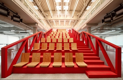 Nefa Architects обустроили образовательный хаб для компании ДКС на территории фабрики «Большевик». Красный амфитеатр в самом центре – рифмуется с биографией места и подает концентрированный сигнал о том, где именно в этом пространстве происходит главное.