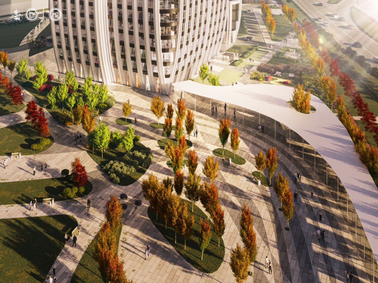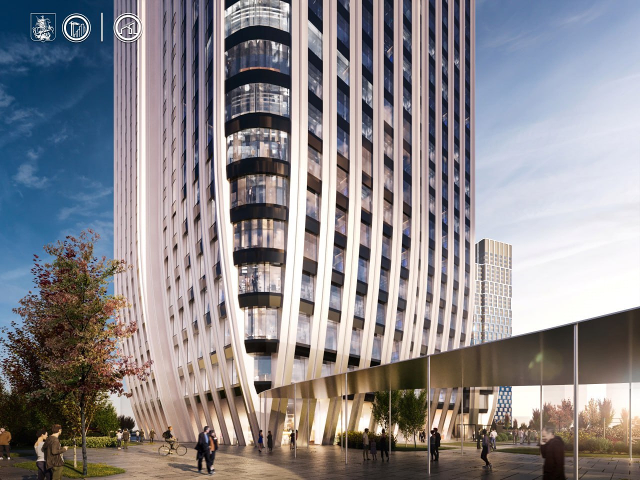 Для отделки фасада и цоколя будут использованы стеклянные и металлические панели в сочетании с решетками в технических зонах. Для остекления предусмотрены энергосберегающие двухкамерные стеклопакеты.