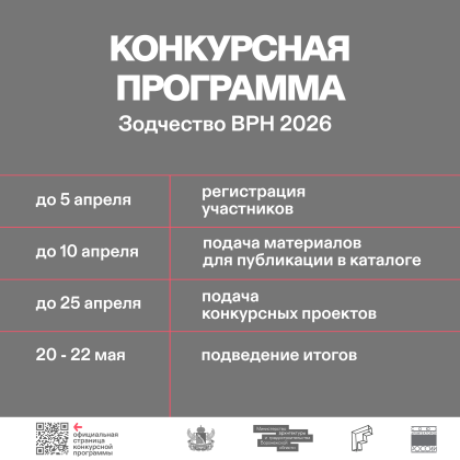 Также состоится смотр-конкурс «Творчество студентов архитектурных вузов и колледжей», в котором примут участие как нынешние студенты, так и выпускники 2025 года, в возрасте от 18 до 25 лет. На конкурсе можно будет увидеть выпускные квалификационные работы учащихся профильных учебных заведений всей страны и зарубежья.