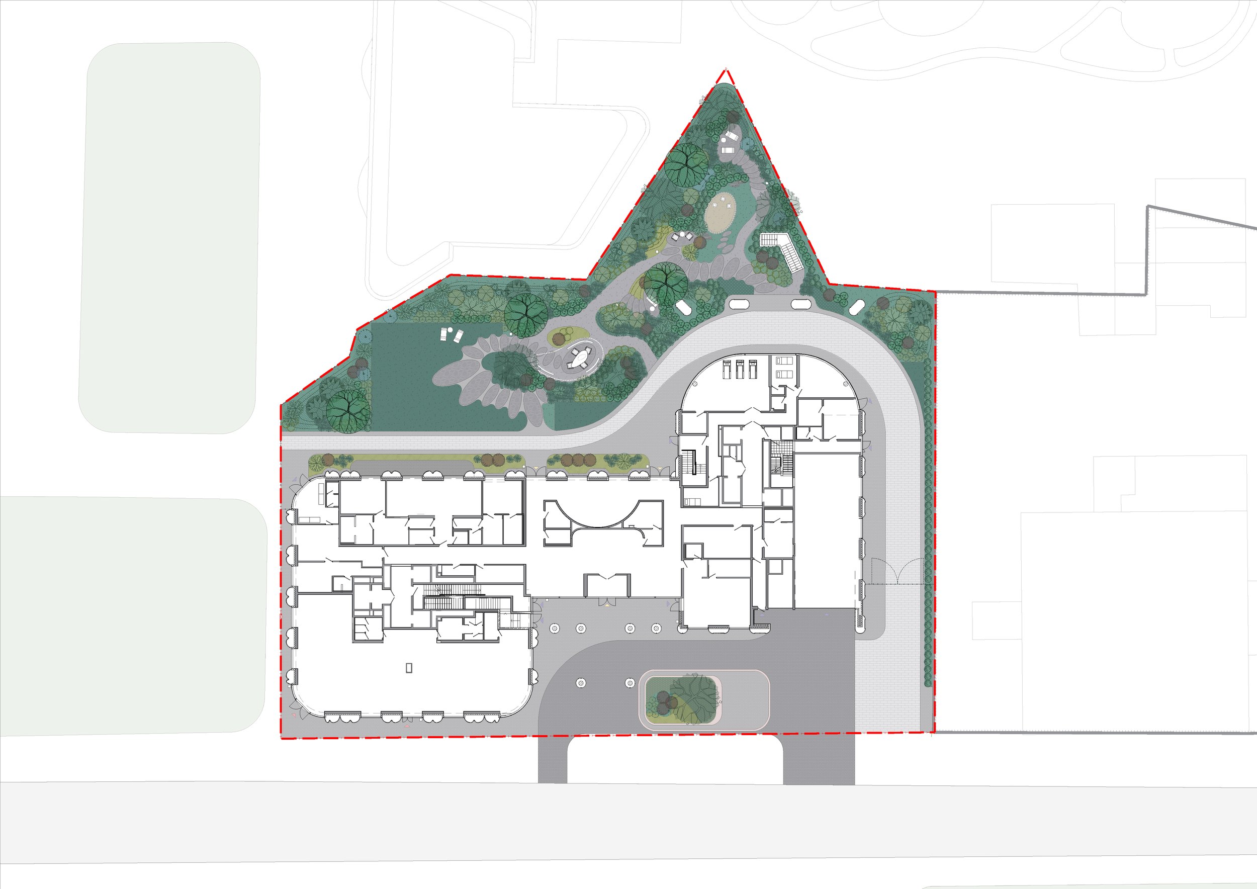 The project’s master plan is fairly simple: it essentially repeats the composition of the existing building on the site, only with the side risalits rising to 46 meters, while the central one, by contrast, is lowered to form the lobby uniting the two towers. The “tower in green” is set slightly back from Pogodinskaya Street, complicating the perception of the silhouette and freeing space for a ceremonial entrance zone: a car pulls into a small lay-by directly to an entrance protected by a canopy.
