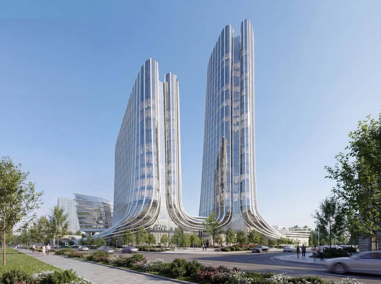 Итак, концепция MUZA FORM (первые три картинки) – две башни (95 м и 149 м) и 5 объемов-«лепестков» пониже опутаны бионическими линиями, повторяющими прием АПЕКС в ЖК «Страна-Сити» и еще много чего (включая Ближний Восток). Впрочем, говорить о повторах, цитатах и заимствованиях здесь даже неуместно, такие картинки регулярно появляются в пабликах, делал их человек или ИИ, для какого района, с какой целью – все это неважно перед первоочередной задачей: выдать форму, отвечающую ощущениям заказчика, его чувству современности. И в данном конкурсе это опять сработало.