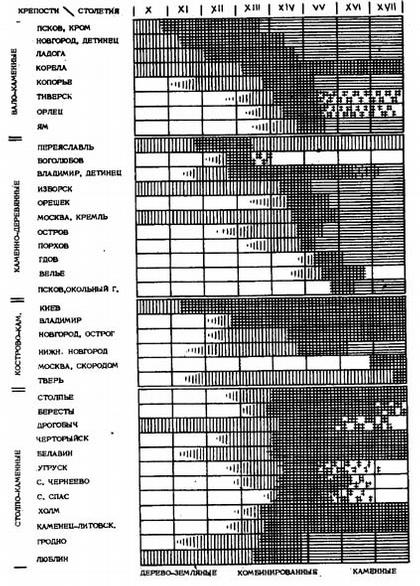 Полученные данные о комбинированных крепостях древней Руси суммированы на схеме-диаграмме. Схема пока несовершенная, так как нет еще окончательных данных о времени возникновения многих крепостей в дерево-земляном, комбинированном, даже каменном видах (многие крепости просто еще не исследованы). Поэтому отдельные параметры пришлось дать в диаграмме условно.