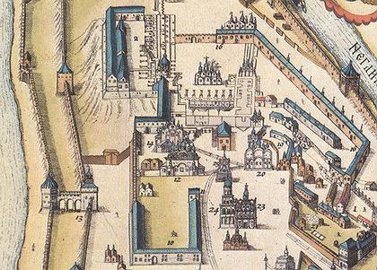 Место расположения Столовой избы достаточно четко локализуется. По определению И. Е. Забелина, она стояла позади Средней палаты против алтарей церкви Спаса на Бору.[121] На схематическом плане великокняжеского дворца, приводимом С. П. Бартеневым, она также помещена за Золотой палатой, около ее юго-западного угла. Напомним также, что ее расположение за Средней палатой подтверждается указанием Дополнительной статьи 1526 г. о наличии в сенях перед палатой дверей, ведущих к Столовой избе. О местоположении Столовой избы косвенно свидетельствуют и Посольские книги. В них, в частности, сообщается, что 6 июня 1566 г. при встрече следовавших в Столовую избу литовских послов Юрия Александровича Хоткевича, Юрия Васильевича Тишкевича и писаря Михаила Гарабурды «в столовой избе и в сенех и по крылцу, меж набережные полаты и золотые полаты, дворяне сидели в золотном платье».[122] Таким образом, вход в Столовую избу, которым следовали послы, замыкал пространство между Набережной и Средней палатами. Генрих Штаден в своем описании дворца называет это пространство «площадкой перед палатой великого князя, в которой он обычно обедает». Очень важно для нас его указание, что «палата великого князя (по контексту можно понять, что речь идет именно о Столовой палате. - С. П.) была деревянной постройки». Между приводимыми им в этом отрывке обозначениями Столовой избы и Набережной палаты есть и терминологическое различие («Sahl» и «Pal1ast»).[123] Более поздние известия, приводимые И. Е. Забелиным, также подтверждают, что это было деревянное сооружение. На изображениях «Книги об избрании на царство Михаила Романова» за Средней Золотой палатой показано несколько высоких тесовых кровель, очевидно принадлежащих деревянной постройке.[124]