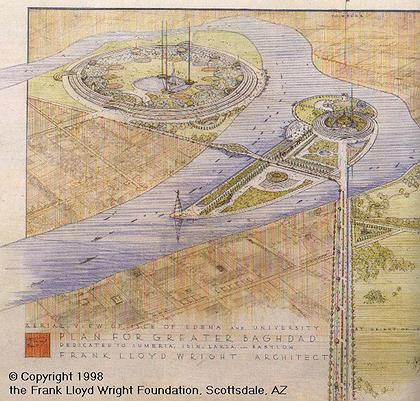 Исторически Багдад, основанный вторым аббасидским халифом ал-Мансуром, был связан с райской образностью в Коране. Город был прозван Мадинат ас-Салам (Град мира). Имя Багдад является персидским по происхождению с явной семантической окраской – слово «Bag» означало «Бог», а целиком слово переводится как «Богом данный». Европейские путешественники Багдад называли Вавилоном. Семантико-лексические и символические коннотации Багдада в понимании Ф.Л. Райта весьма точны, он много прочитал серьезной литературы, но и пользовался вторичными источниками.