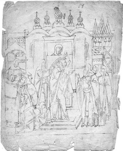 В Музее имени Андрея Рублёва хранятся три иконных образца, на которых изображены сцены из «Сказания о Богоматери Тихвинской»: «Явление иконы рыбакам на Ладожском озере», «Чудесное перенесение сруба на другой берег реки» и «Поклонение иконе князя Василия III в Тихвинском монастыре» [1], поступившие в 1959 году в дар от Е.А. Жидковой (ранее находились в коллекции Г.В. Жидкова). Все три листа одновременны и выполнены на идентичной бумаге в технике детального оттиска без прорисовки. На одном из листов содержится филигрань «Голова шута в повороте вправо с семью бубенцами и литерами C L P» (близка № 444 по Диановой [2]), которая позволяет датировать бумагу приблизительно 1660-ми годами.