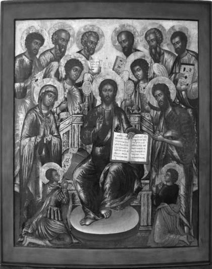 На иконе изображен Деисус типа Седмицы. По сторонам сидящего на престоле Христа в верхнем ряду изображены апостолы Петр и Павел, а так же четыре евангелиста. Ниже архангелы Михаил и Гавриил, Богоматерь и Иоанн Предтеча. Внизу коленопреклоненные мученики Димитрий и Георгий. Обычные для иконографии Седмицы изображения святителей отсутствуют. Сохранность авторской живописи на иконе в целом хорошая, хотя есть многочисленные довольно грубые антикварные прописи по уратам, в частности, на нимбах. По стилю письма икона соответствует произведениям мастера рубежа XVII-XVIII веков. Очень близкую композиционную и стилистическую аналогию ей представляет образ «Богоматерь на престоле, с избранными святыми», созданный Улановым в 1698 году для местного ряда иконостаса Похвальского придела Успенского собора Московского Кремля.
