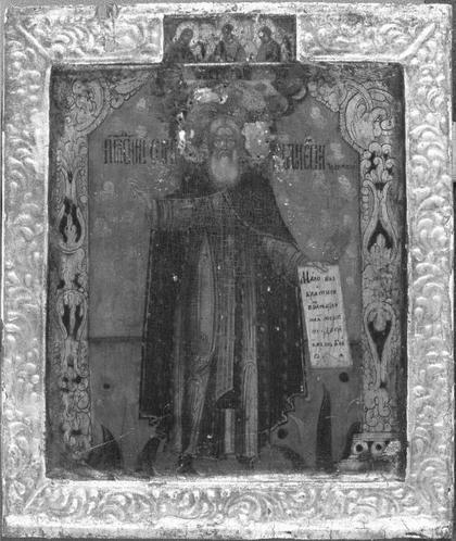 В центре в орнаментальном обрамлении фронтальное изображение святого в рост с седыми волосами и окладистой бородой, в охристом хитоне, зеленом омофоре с красными крестами и черном гиматии. Правой рукой благославляет, в левой развернутый свиток. На свитке одна из вариаций текста завещания Сергия Радонежского: «Мало вы // братия возлюблен//ная терпi//те. Да прi//имемъ Бла//гая». Вверху - изображение Троицы Ветхозаветной. На красно-коричневом поземе - остроконечные побеги с шарообразными цветами. Поля с рельефным растительным орнаментом.
