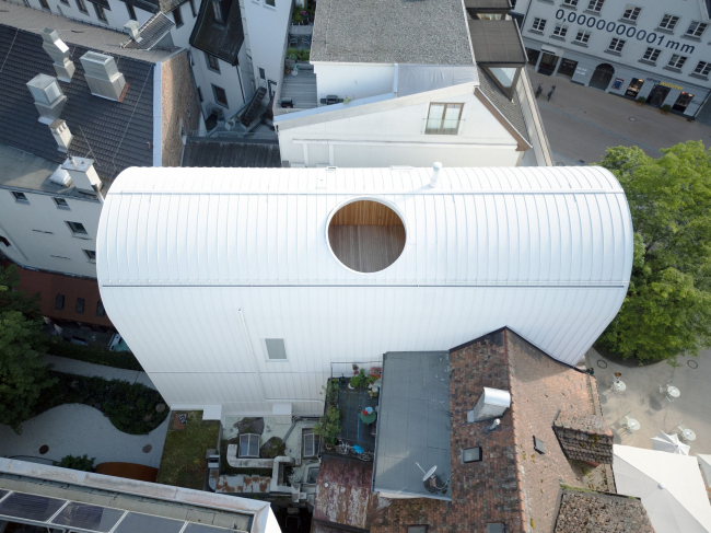 Постройка HdM вписана между сооружением с бетонным фасадом 1970-х и традиционным домом с деревянными ставнями и черепичной крышей. Вытянутый участок (8 м х 23 м) одной узкой стороной выходит на площадь, второй – в зеленый дворик в центре квартала. Продольные стены-брандмауэры, как и полуциркульный свод кровли, обшиты светлым металлом, по цвету соответствующим историческому фасаду – нежно-голубому, почти белому, с ярко-белым декором. Над историческим фасадом и со стороны двора устроены балконы-террасы.