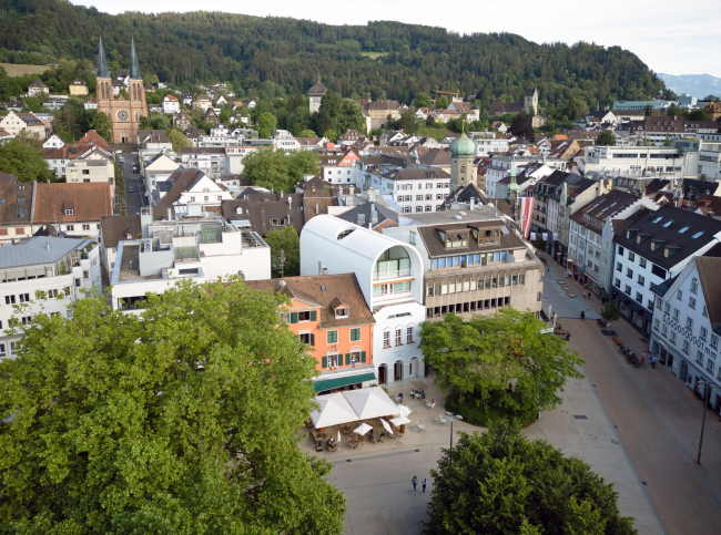 Дом на площади Корнмарктплац, в центре Брегенца на берегу Боденского озера, появился еще в XVII веке, но многократно перестраивался, меняя функцию – пивоварня, кинотеатр, банк, мебельный магазин, клуб и бар. Существующий фасад в стиле необарокко относится к «банковскому» периоду – началу XX века. Уже в наши дни у здания сгорела кровля, и после оно долго пустовало, став непригодным к использованию. Поэтому все, кроме фасада, пришлось снести, и Herzog & de Meuron фактически работали «с нуля», учитывая лишь контекст – всегда определяющий для этих архитекторов.