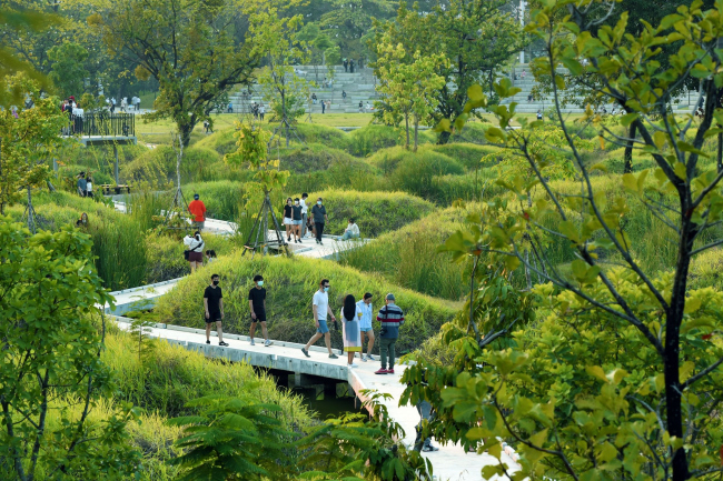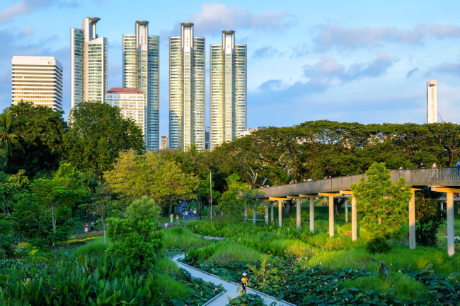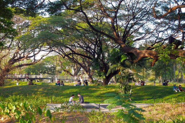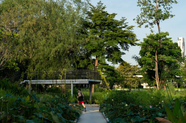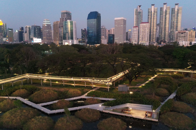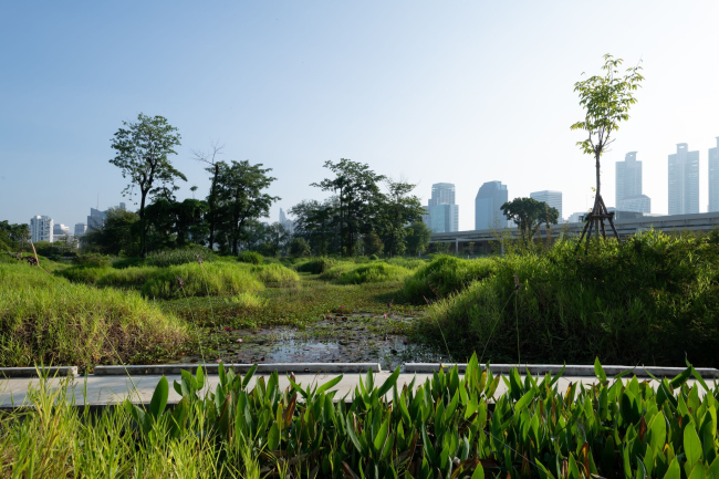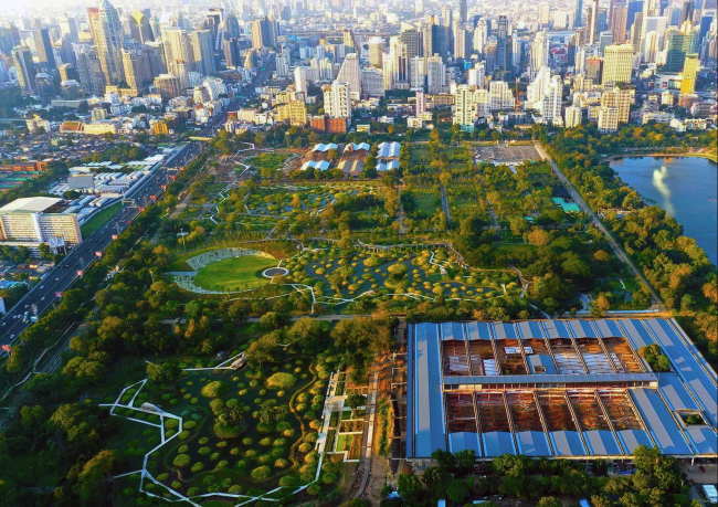 Парк Бенджакитти спроектирован китайской студией Turenscape на месте промзоны в центре Бангкока как устойчивая к подтоплению и засухе ресурсоэффективная зеленая зона.