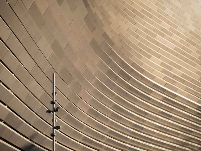 Стадион Сантьяго Бернабеу – реконструкцияФото © Marcus BredtТеперь арена обернута новым фасадом поверх старого: в пространстве города оболочка из нержавеющей стали выглядит одновременно нейтрально и современно, скрадывая реальные размеры стадиона – в том числе благодаря своей «переменчивости» в зависимости от освещения.