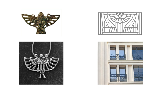 Светлая гамма фасадов, натуральный камень и ритм пилонов отсылают к зданиям Администрации губернатора Пермского края, ЦУМа и гостиницы «Урал». «Косичка» из травертина и краснокирпичные вставки над террасами перекликаются с фигурной кирпичной кладкой часовни святителя Стефана Великопермского и доходного дома купчихи Барановой. Металлические ограждения выполнены по мотивам Пермского звериного стиля. Референсом послужили голова медведя и трехглавая птица счастья. Медведь – доминантный образ в культуре древних племен Урала, а птица счастья – символ семейного счастья и благополучия.