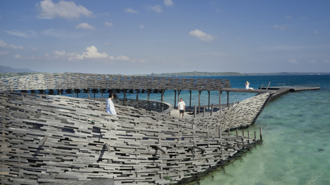 Многофункциональная платформа по проекту индонезийского бюро RAD+ar на частном острове в Яванском море выстроена из вторично использованного дерева местных твердых пород.