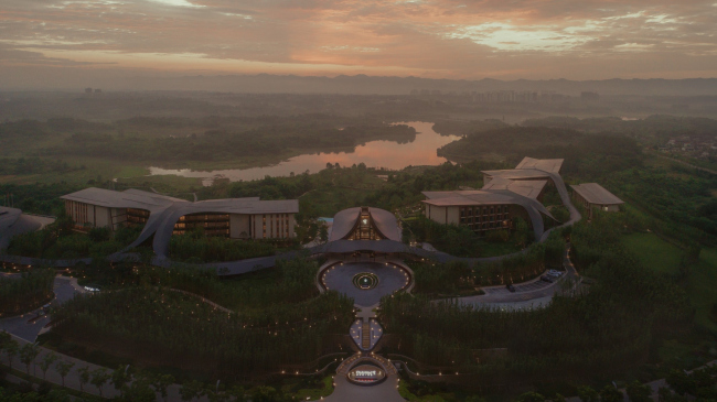 Новый гостиничный комплекс «Хэйлунтань» (что можно перевести как «Пруд Черного дракона») французского оператора Club Med расположен рядом с одноименной системой озер примерно в часе езды от мегаполиса Чэнду, столицы китайской провинции Сычуань. Проект, получивший название The Spine (то есть позвоночник, хребет), разработан бюро AIM Architecture, которое, как это принято, сделало отсылки к традиционной местной архитектуре. В данном случае ориентировались на «устойчивую» кластерную планировку, характерную для деревень на равнине Чэнду, при которой небольшие постройки, дворы, возделанные поля и поросшие лесом участки соединены системой ирригационных каналов.