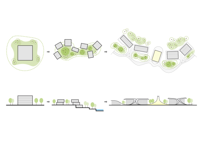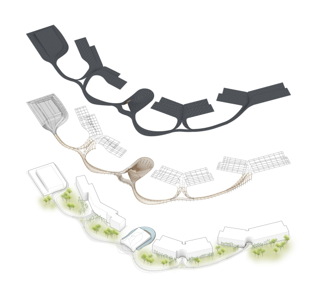 Жилые корпуса, вмещающие в общей сложности 350 номеров, расположены по бокам и окружены садиками. Все объекты окутаны системой широких крытых переходов, как щупальцами спрута, – благодаря бионической форме центрального павильона образ считывается еще более явно.