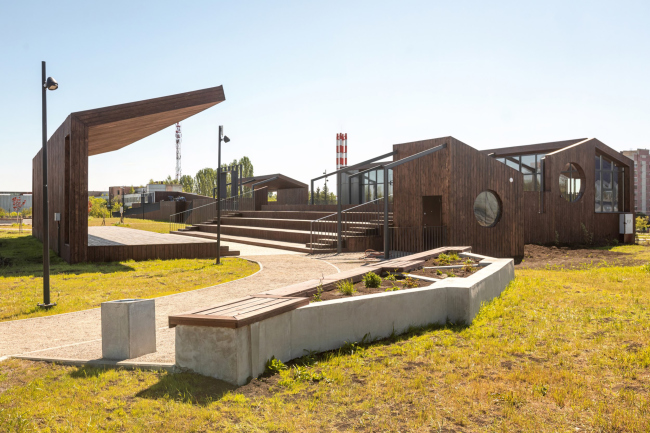Для единственной зоны застройки – платформы с павильонами, зоной воркаута и амфитеатром – использовано существующее поле бетонных фундаментов. Таким образом, платформа вытянулась своеобразным кораблем вдоль южной границы парка, став его знаковым объектом.