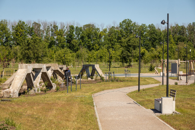 В целях безопасности были выборочно демонтированы наиболее обветшалые конструкции и укреплены более крепкие. «Полосы» сложенных ферм «оградили» кустарником, что повысило озелененность участка. Существующие бетонные основания используются как опора для нового строительства некапитальных объектов парка.