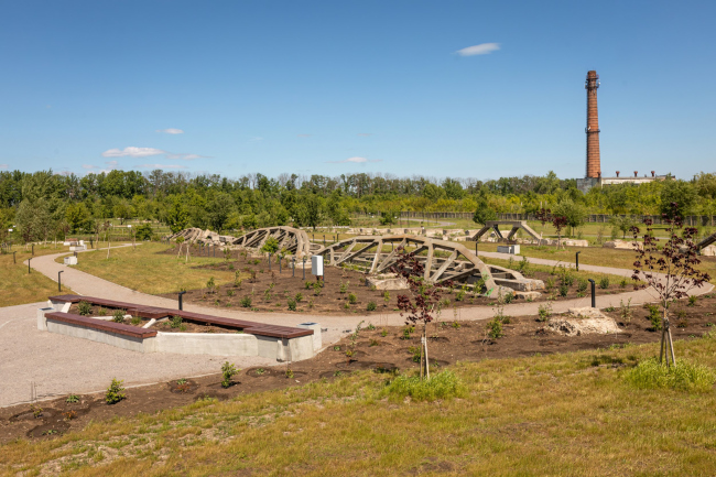 Первый пост-индустриальный парк в России появился в Острогожске по проекту консорциума Citizenstudio и Новая земля. Вместо дорогой и неэкологичной утилизации бетонных останков недостроенного завода архитекторы предложили сделать их частью ландшафта парка.