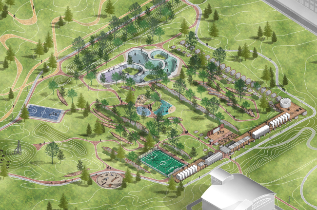 Вся остальная территория превратилась в ландшафтный парк. Существующей линейной структурой бетонных конструкций он делится на зоны: спортивную, детскую, рекреационную.