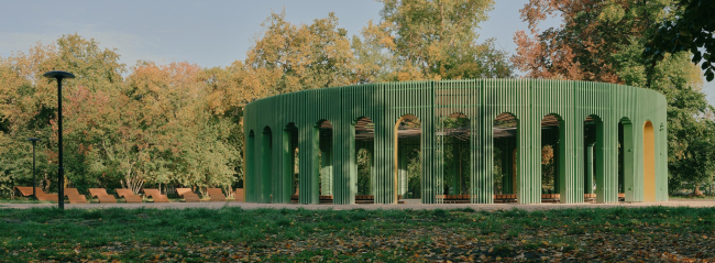 Бюро MDVA спроектировало для парка в Барнауле павильон, внутри которого располагается трехчастная театральная сцена с амфитеатром. Внешний контур строения формируют аркады из деревянных ламелей, а тентовый навес защищает зрителей от непогоды.