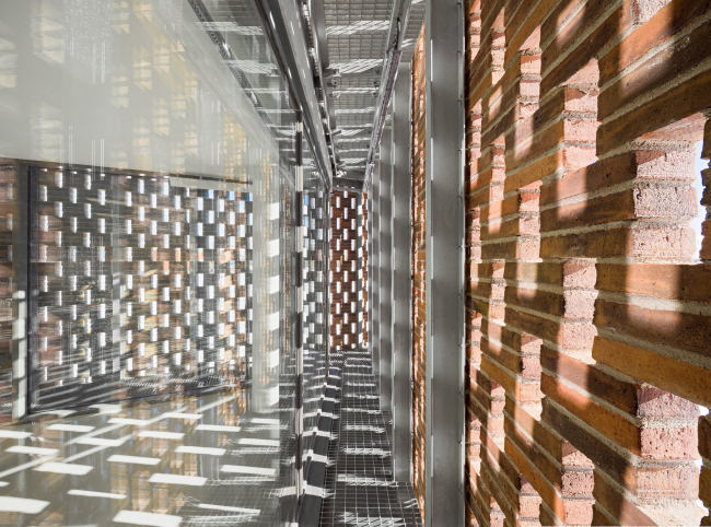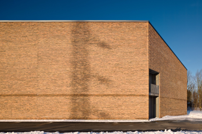 Простой прямоугольный объем нового корпуса получил эффектные срезы в торцевых частях, которые по замыслу архитекторов отсылают к двухчастной композиции исторического здания. На втором этаже самой большой – центральной – секции расположены оборудование и пункт управления, а первый уровень используется для его обслуживания. Постройка имеет сборные бетонные конструкции и дополнительную стальную решетку, на которой закреплены фасады из кирпича «вассерштрих» (формы для его изготовления, чтобы было легче извлечь глиняную заготовку, смачивают водой, а не применяют с этой целью более привычный песок): у него характерная «мягкая» фактура. При этом использовано сразу четыре разных рисунка кладки: от проницаемой решетки на торцах, за которой спрятано остекление, до плотной поверхности основного объема. Чтобы осуществить задуманное, понадобилось создать 3D-модели фасадов и на их основе разработать 13 спецформ кирпича.