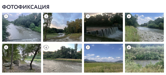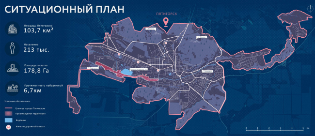 Авторы рассматривали протяженный – 6.7 км – участок в западной части города, между историческим центром и несколькими планируемыми новыми стройками. Примерно в 2 км к северу от реки и от озера Новопятигорское в городе планируется новый общественно-деловой центр: место развивается, и ему нужна новая окультуренная набережная. Дело осложняется тем, что вокруг реки – достаточно много территорий частной застройки ИЖС, в некоторых местах, особенно в южной части, она подходит к реке вплотную.