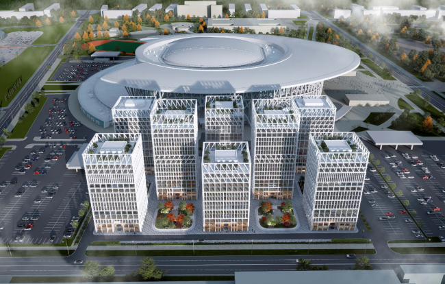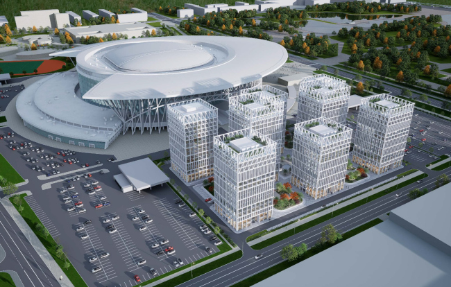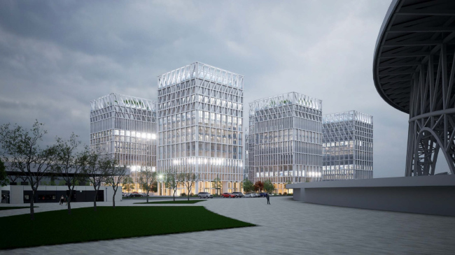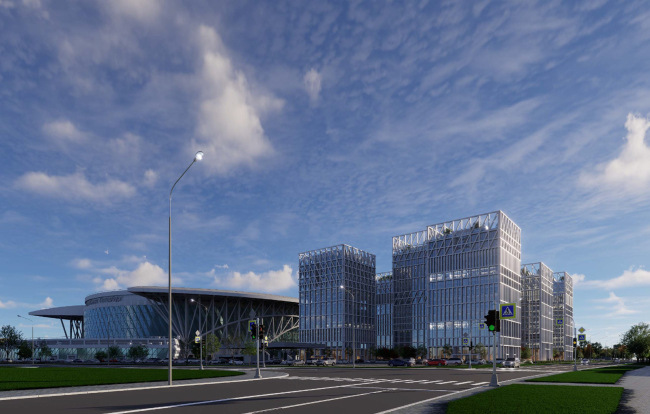 Участок тянется вдоль Кузнецовской улицы, с запада и севера его ограничивают «поля» парковочных мест, оставляя под застройку «остров» в срединной части, как раз на оси арены. Учитывая контекст и ограничения, архитекторы обратились к «шпалерной» композиции: квадратные в плане башни в регулярном ритме чередуются с квадратами скверов и площадей, образуя лабиринтоподобную, но проницаемую среду – виды на парк и арену сохраняются, хоть и в несколько «магриттовской» .