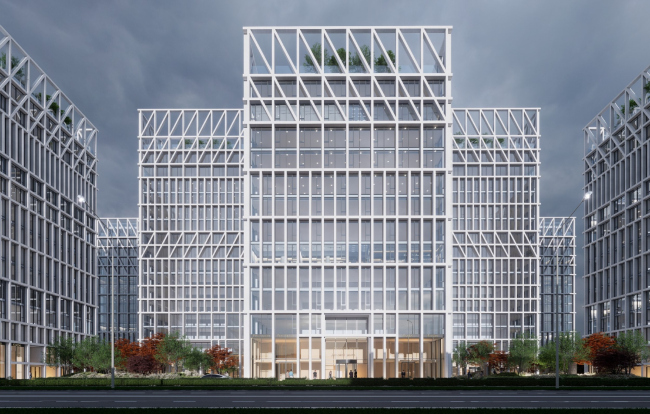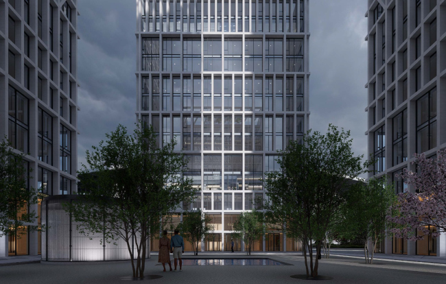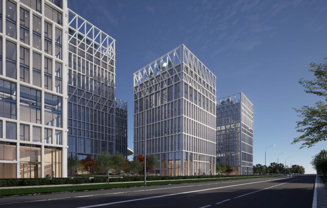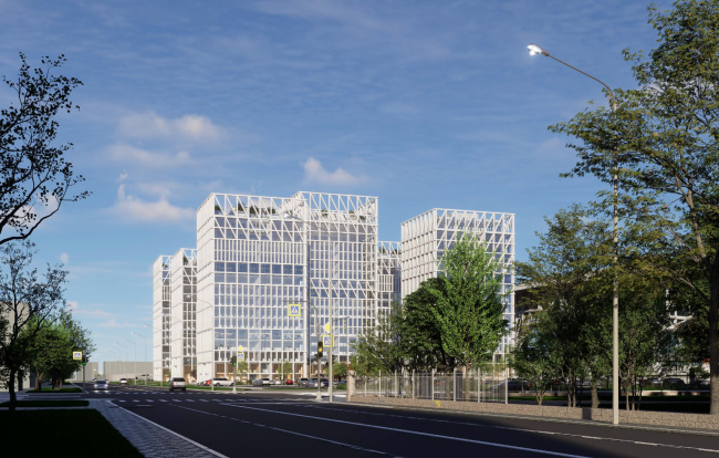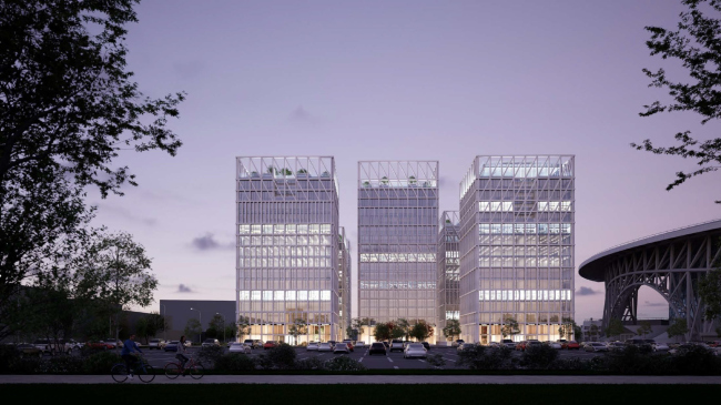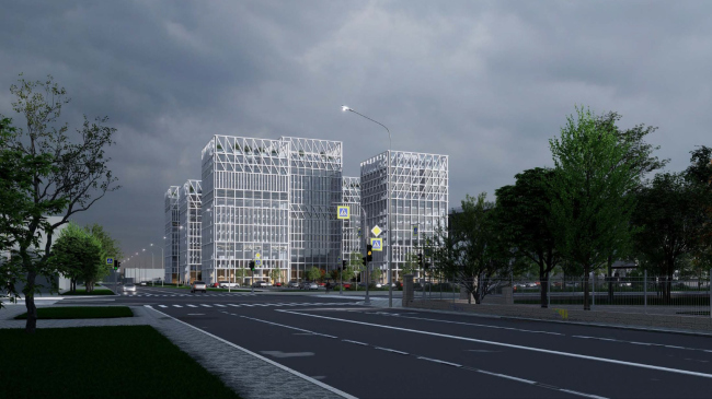 Высота башен растет от периферии к центру, но не выходит за пределы разрешенных в этом месте 60 метров, включая парапеты эксплуатируемых кровель. Фасады реагируют на решетчатую галерею СКА Арены похожей, но более жесткой сеткой.