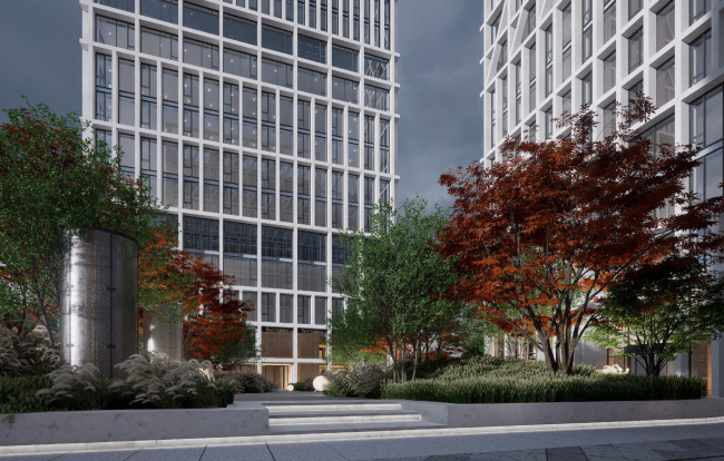 Шесть садиков между зданиями образуют систему камерных общественных пространств, доступных всем горожанам. Первые этажи отдают торговле и ресторанам, на центральной площади запланирован фонтан, который в зимнее время превращается в каток. Сюда же выходят лифты подземных парковок, занимающих два подземных этажа.