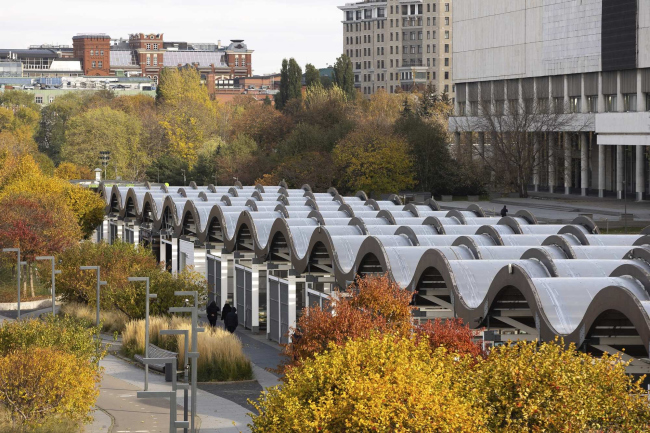 Популярен этот материал и для павильонов и схожих строений в России – особенно в сочетании с деревом. Нельзя не вспомнить перекрытия комплекса на Крымской набережной в Москве (2013, «Архитекторы Асс»): сооружение в полной мере использует высокую гибкость и пластичность сотового поликарбоната, который при этом не боится солнечного жара, ветра и осадков. Получившиеся «волны» как будто вторят водам реки, задавая ритм начинающемуся здесь благоустроенному общественном пространству, где мотив волн встречается еще не раз.