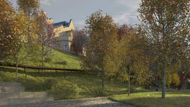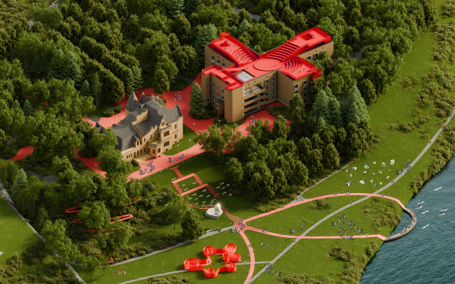 Территория замка Успенское расположена на землях, известных издревле, обладающих богатым историко-культурным значением. Щедрые пласты истории, сформировавшие это место, откликаются эхом в нашем видении развития усадебного комплекса. Мы берем за основу нашего метода принцип «витализации», принцип отношения к месту как к живому организму. В таком отношении у этого организма есть «сердце» – замок, будет «голова» – существующий бывший лечебный корпус, который станет инновационным учебным кластером. По концепции так же появятся: «тело» – павильоны с разным функционалом на территории леса, «душа» – опоясывающий путь, который пронизывает весь лес и становится в конце пути пирсом, связывающим реку с территорией.