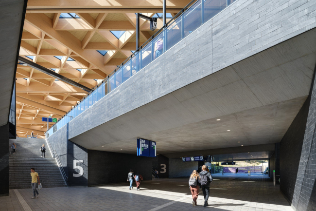Интуитивное перемещение пассажиров по вокзалу заложено в основу проекта. От платформ видны все ключевые опции для пересадок и дальнейшего путешествия: привокзальная площадь, автовокзал, зона высадки пассажиров, стоянка такси и велопарковка на 5500 мест. Мост для пешеходов и велосипедистов к востоку от станции упрощает их передвижение. Одновременно им удастся полюбоваться открывающимся отсюда панорамным видом лесов Велюве.