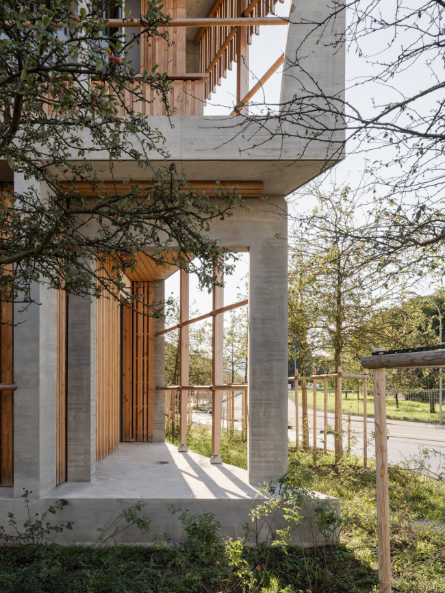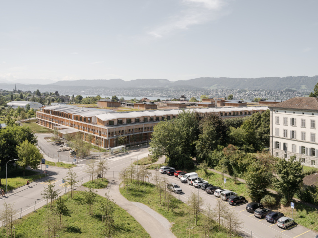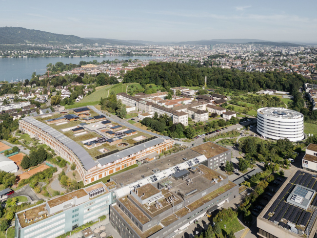 Исследовательский и образовательный корпус выглядит совершенно иначе: это поставленная выше по склону 7-этажная бетонная «ротонда» с атриумом в центре. Ее нижняя часть, вписанная в перепад рельефа, решена как «агора» с тремя аудиториями, вестибюлем и бистро, открытым также и местным жителям. Благодаря мобильным перегородкам для крупного мероприятия все части этого яруса можно объединить, создав пространство на 670 мест или же на 1200 стоящих человек. Через фасадное остекление «агора» связана с высаженным вокруг плодовым садом, типичным для района Бургхёльцли, а через окулус в перекрытиях – с атриумом выше.
