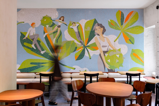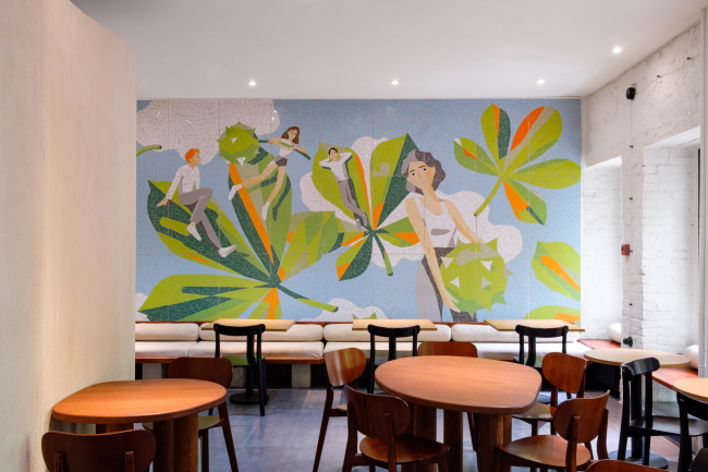 Главным акцентом стала авторская мозаика, которая придает кафе театральности и характерности. Нежно-голубые и зеленые оттенки с вкраплением оранжевого создают особенно теплую и летнюю атмосферу заведения. Листья каштана появились на ней не просто так: улица Комиссаржевской славится обилием зелени этих деревьев.