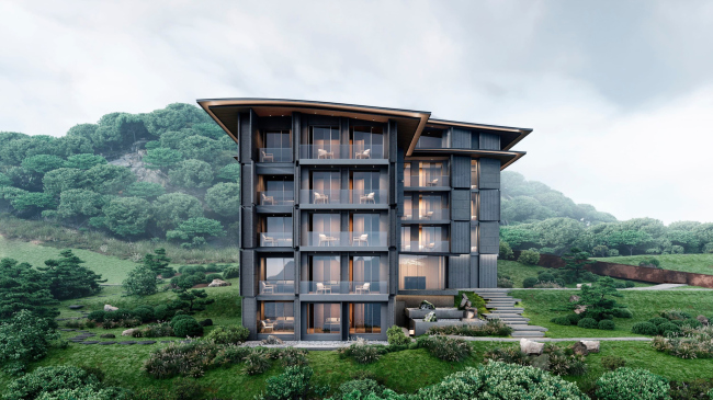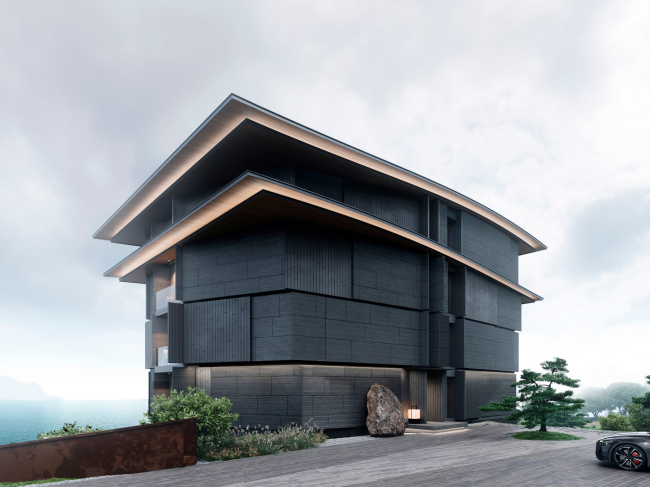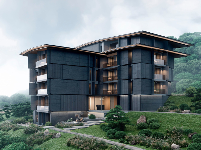 Фасад выполнен в строгих линиях, отсылающих к узорам мужских кимоно. В отделке использованы прямоугольные блоки, которые формируют рельефную поверхность и создают игру светотени. Эти элементы также обеспечивают приватность для гостей, так как выступают на уровне окон и балконов, защищая их от посторонних взглядов.