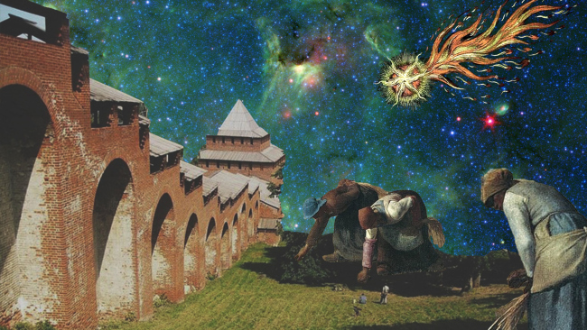 На этапе сбора фактуры родился образ, который стал символом соединения прошлого и будущего – комета, угодившая прямиком в Кремль. После ее падения остались руины старого и осколки нового, неведомого.