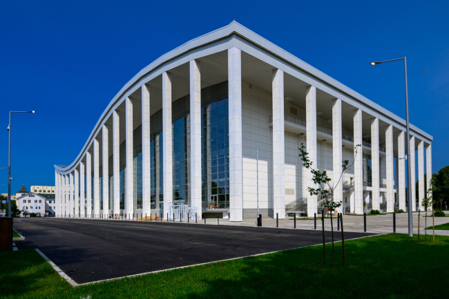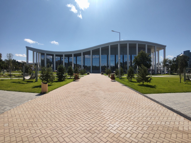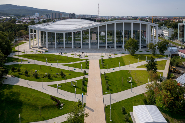 Полученный абрис вторит и функции здания, и очертаниям окружающих сопок. Разнонаправленное движение двух волн умножается в рисунке дорожек аллеи, устроенной перед главным входом также по проекту ПИ Арена. В будущем парковая территория вокруг Центра водных видов спорта будет расширяться за счет вывода зданий Министерства обороны.
