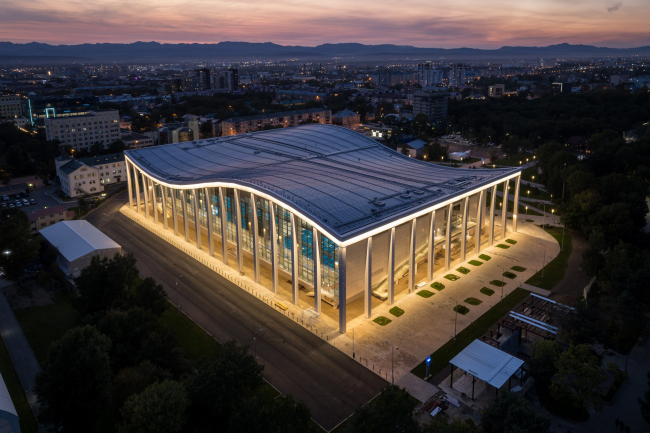 В двух противоположных углах исходный объем волнообразно повышается, и его накрывает кровля-гипар, сделанная из алюминиевых фальцевых конструкций. Для кровли, как и всего здания, выполнен полный комплекс расчетов и моделирования на сейсмику, ветровые и снеговые нагрузки.