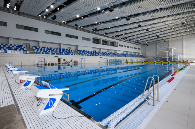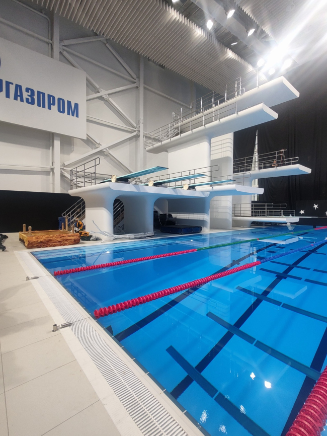 Второй бассейн предназначен для прыжков в воду и синхронного плавания, поэтому его глубина – 6,1 метра. Эту часть зала украшает комплекс трамплинов и вышек высотой до 10 метров – своей разветвленной обтекаемой структурой он несколько напоминает виллу, построенную по проекту Захи Хадид для Владислава Доронина. Этот бассейн также можно использовать для плавания на «короткой воде». А система «второго дна» – гидравлическая платформа, которая позволяет регулировать глубину – позволяет с комфортом проводить тренировки для новичков и маломобильных людей.