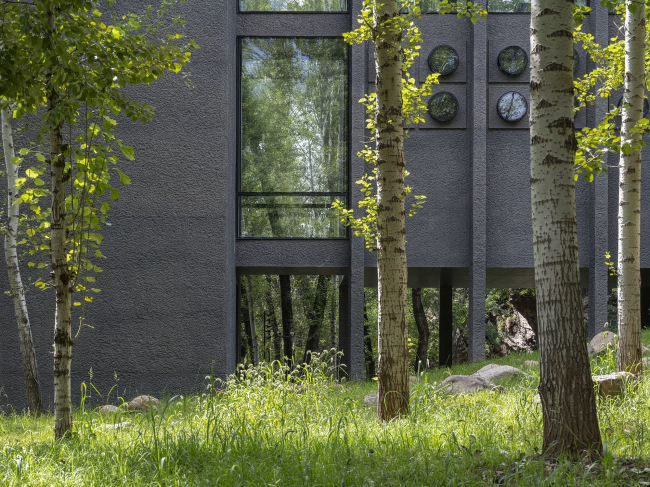 ×òîáû êàê ìîæíî ìåíüøå âíåäðÿòüñÿ â ïðèðîäíûé ëàíäøàôò, àâòîðû ïðîåêòà ïðèïîäíÿëè ñâîå ñîîðóæåíèå íà 10 êîëîííàõ. Òîëüêî ñåðâèñíûé óçåë â âîñòî÷íîé ÷àñòè ïîëíîöåííî êàñàåòñÿ çåìëè è äàæå óõîäèò ïîä íåå: ïîäâàëüíûé ýòàæ îõâàòûâàåò 200 ì, ïî÷òè ïîëîâèíó îáùåé ïëîùàäè áàíü. Óçåë è îñíîâíîé îáúåì çäàíèÿ ê çàïàäó ñîåäèíåíû íà êàæäîì óðîâíå ìîñòîì-êîðèäîðîì.