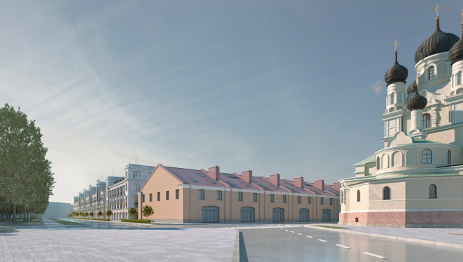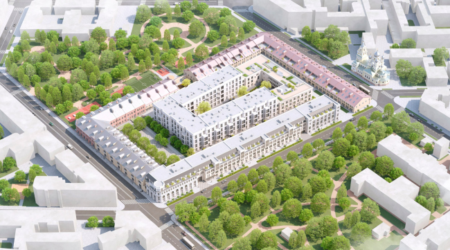Как и в предыдущем случае, проводится реставрация уцелевших зданий и воссоздание незаконно снесенных. Со стороны Евгеньевской улицы периметр замыкает новый протяженный объем. Внутри образовавшегося квартала архитекторы размещают еще один. Таким образом формируются внутренние улицы и двор-колодец, герметичность которого отчасти компенсирует небольшая высота зданий, соответствующая установленным для этого места регламентам.