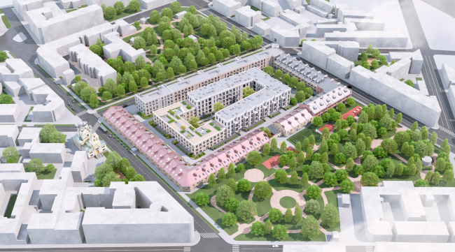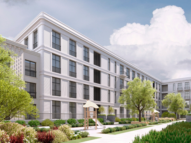 Меньшее каре внутреннего квартала срезано на один этаж, чтобы открыть вид на Церковь Шестоковской иконы Божией Матери. В этой части размещается ФОК с эксплуатируемой кровлей. Для проницаемости комплекса устроено несколько арок. Качество жилья повышают приватные террасы первых этажей, увеличенная до 4,5 метров высота потолков, крупномерная зелень.
