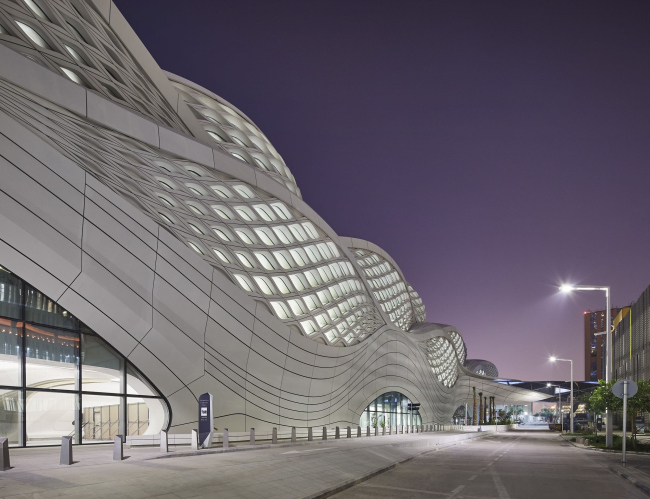 Синусоиды отражены и на ажурных фасадах из панелей сверхвысокоэффективного бетона. Их проемы при этом выступают современным аналогом традиционных исламских решеток-машрабия, пропуская внутрь солнечный свет, но защищая интерьер от перегрева. Общий узор вдохновлен также и рябью, которую создает на песке ветер пустыни.
