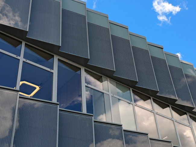 Проект изначально предусматривал солнечные модули, что придало зданию лаконичный и современный вид. Вертикальные элементы, выбранные для оформления фасада, стали нестандартным решением и подчеркнули уникальность архитектурного проекта. Цветовая гамма соответствует корпоративному стилю.