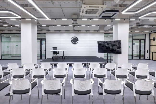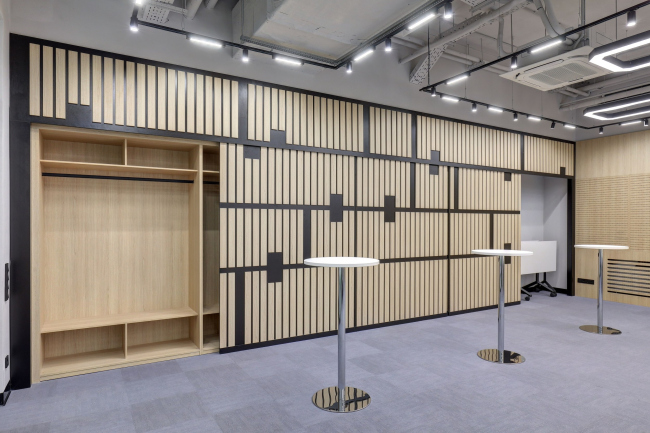Графика размещения инверторов на солнечных электростанциях вдохновила дизайнеров на создание акустических панелей, за которыми скрываются шкафы для хранения одежды и мебели в конференц-зале. Пространство оборудовано мобильными элементами: трансформируемым подиумом, передвижной мебелью, что позволяет легко изменять конфигурацию зала в зависимости от текущих задач.