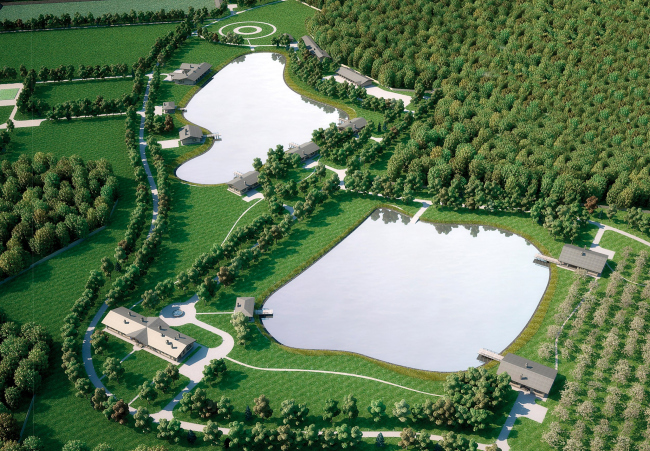 Описание предоставлено архитекторами Комплекс охотничьего хозяйства включает инфраструктуру, необходимую для загородного отдыха: баню, клуб, искусственные водоемы и жилые домики. Все объекты сочетают в себе современные архитектурные решения и традиционные материалы.