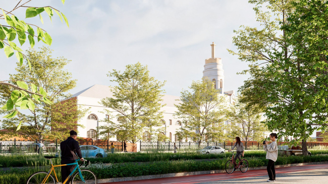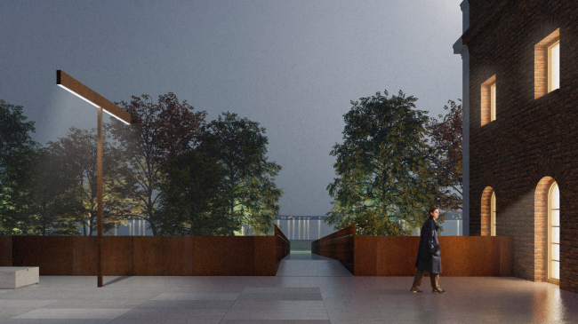 Следующий этап – улучшение связи территории завода с городской средой. Часть комплекса, как уже упоминалось, скрывает дамба, поэтому артикулируется нижний променад и верхняя набережная, которые соединяются лестницами.