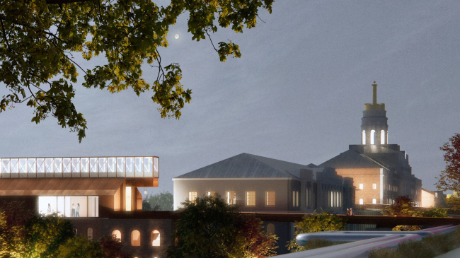 Наконец, в корпусе Т надстроенный в советское время третий этаж заменит двусветный объем выставочного зала. В его коньке встроена кран-балка, с помощью которой экспонаты можно загружать прямо с улицы. Над кран-балкой расположен зенитный фонарь с системой автоматического зашторивания.