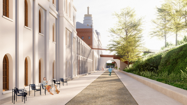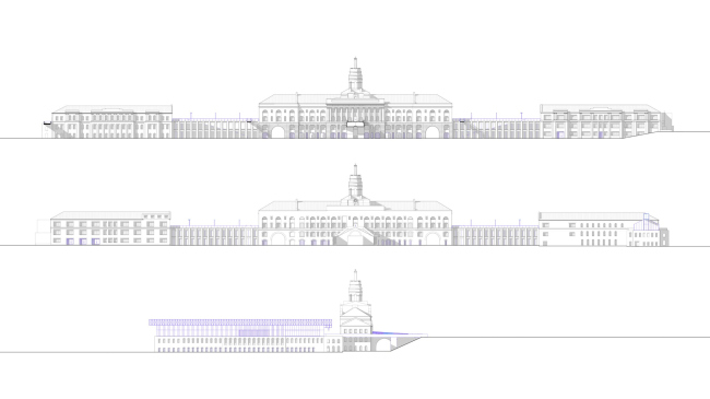 Попасть в комплекс с набережной позволяют три моста. Центральный каменный арочный мост северного контрфорса – исторический. Его дополнят симметричные переходы, проложенные на кровлю новых объемов в корпусах С2 и С4 – тех самых, которые были перестроены в советское время. Архитекторы называют эти пространства на кровле «городскими балконами» и «площадями». Что вполне логично, учитывая одинаковый с набережной уровень, а также новые виды, которые откроются горожанам. С крыш-площадей также можно зайти в соседние более высокие корпуса. Тем или иным способом все корпуса связываются в единый непрерывный маршрут.